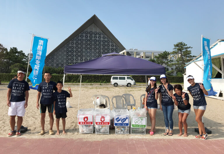 また、2017年より、神戸市港湾局と連携し、海水浴場開催期間中は毎日、海岸にゴミステーションを設置し、私たちボランティアが海水浴場来場者自らにゴミの分別収集を呼びかける参加型プロジェクト「スマイルビーチプロジェクト」に取り組み、日本で4番目となる国際環境認証“ブルーフラッグ”の取得に貢献しました。