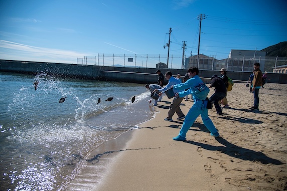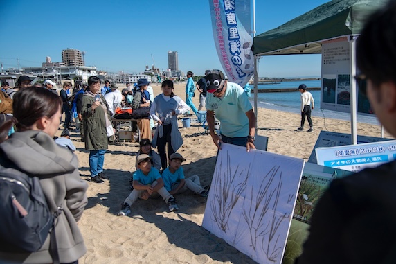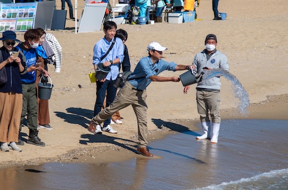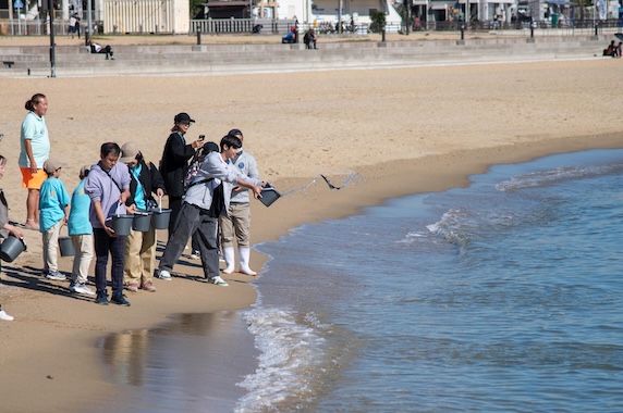 第308回クリーンアップ&稚魚放流&アマモの移植体験を開催しました!! 11.9(Sat) 2024年11月9日(土)、神戸海さくら308回目のビーチクリーンを行いました。 今月は風も無く、穏やかで、暖かい良いお天気の中、160人もの方々が参加してくれました!! 今回のイベントは、AGCさんから協賛いただいたのですが、なんと、素敵なプレゼントまでご準備いただきました!!!!!参加された皆様は思いがけないサプライズとなり、とてもラッキーでしたね⭐︎ また、阪急交通社さんも社員研修として参加してくださり、9時から環境セミナーをしたのち、須磨海岸の西端からビーチクリーンしてくれました。 ビーチクリーン後の稚魚放流では、とっても可愛い小さなヒラメの子供を須磨の海に返しました!代表も張り切って稚魚放流に参加しました!(下にある写真をご覧ください。笑)無事に大きくなってくれることを願いながら、参加者みんなで海へ放ちました♪ また、アマモの移植では、須磨里海の会さんによるレクチャーを受けつつ、アマモの種子を入れた土を丸めて、泥団子を作りました!吉田会長の貴重なお話も聞いて、ダイバーさんにアマモの団子を海に移植して貰いました! まさに「豊かな海」と言わざるを得ないイベントを二つ同時に開催できましたね!!お子様のキラキラ輝く笑顔が印象的でしたが、大人たちも、稚魚放流をおかわりするくらい心から楽しんでいただいたようで、海を存分に満喫してました⭐︎ぜひ、下までスクロールして写真をご覧ください(^^) ■活動報告・参加者:161人・燃えるゴミ:6袋・ビン、缶:1袋・ペットボトル:1袋 いいお天気! ビーチクリーンの説明をしています。 ビーチクリーンスタート! 阪急交通社さんのビーチクリーンも同時開催でした! 代表による講義を行いました! 分別のお時間です。 阪急交通社さんで記念撮影! そのほかの皆さんで記念撮影☆ サンゲツさんも参加してくれてました!! アマモの種。 アマモの種を泥団子に包んでいきます。 こんな感じ。 ガーゼで包んで、たこ糸で縛ります。 完成! 完成した方から、アマモの重要性についてお話。 皆さん熱心に聞いてくださっています! こちらはヒラメの稚魚。 須磨の海へ放流します! 小さくて可愛い。笑 皆さん、お上手です! 代表も張り切って放流しました!